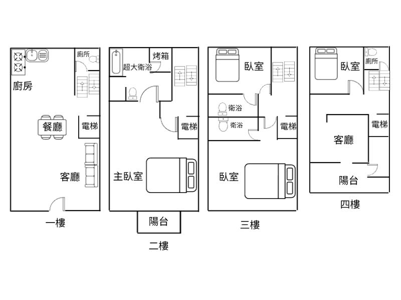 全棟共5房,二樓單層大主臥,大衛浴有烤箱、按摩浴缸