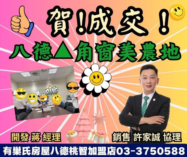 發佈: 2023/07/26 點閱: 186 合作冒泡:蔣經理 及 許吉慶經理賀賀賀~~恭喜成交!!八德在地經營10餘年,店基最穩固新時代房仲, 與其單打獨鬥, 不如團隊合作!☆ 公司每月補助個人行銷廣告預算☆ 總部四大品牌強大聯賣系統☆ 公司提供多元化網路平台曝光協銷☆ 房仲/商仲並行, 創富機會有一席歡迎您的加入 ...請洽: 0927-220-258 許協理