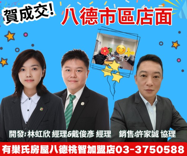 發佈: 2024/01/09 點閱: 107 合作冒泡:林虹欣 戴俊彥 經理 & 許吉慶 協理賀賀賀~~恭喜成交八德在地經營10餘年,店基最穩固,房仲&商仲案源齊全,成交最快速。新時代房仲, 與其單打獨鬥, 不如團隊合作!☆ 公司每月補助個人行銷廣告預算☆ 總部四大品牌強大聯賣系統☆ 公司提供多元化網路平台曝光協銷☆ 房仲/商仲並行, 創富機會有一席歡迎您的加入 ...請洽: 0927-220-258 許協理