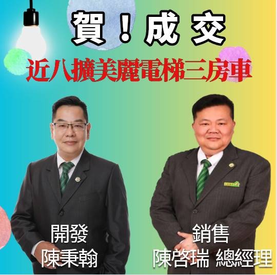 發佈: 2025/04/30 點閱: 179 賀賀賀~~恭喜成交 『近八擴美麗3房車』合作冒泡 陳啓瑞總經理/陳秉翰經理『八德在地經營10餘年,店基最穩固,房仲&商仲案源齊全,成交最快速。』新時代房仲, 與其單打獨鬥, 不如團隊合作! ☆ 公司每月補助個人行銷廣告預算 ☆ 總部四大品牌強大聯賣系統 ☆ 公司提供多元化網路平台曝光協銷 ☆ 房仲/商仲並行, 創富機會有一席 歡迎您的加入 ... 請洽: 03-3750588 忠誠不動產團隊